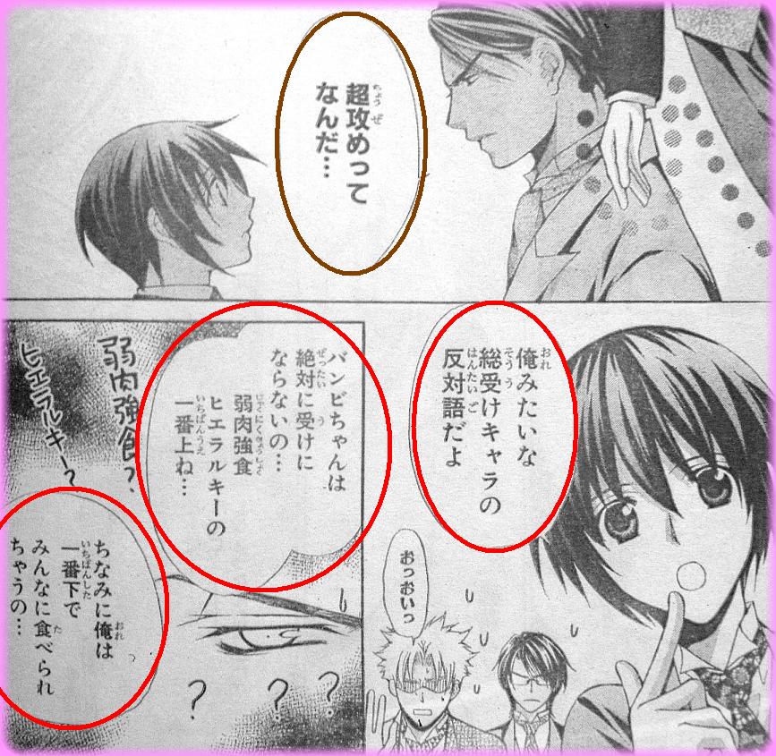 秋羅:俺みたいな総受けキャラの反対語だよ。バンビちゃんは絶対に受けにならないの・・・弱肉強食ヒエラルキーの一番上ね・・・ちなみに俺は一番下でみんなに食べられちゃうの・・・